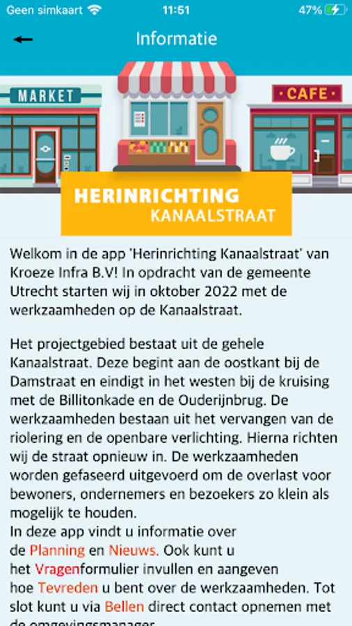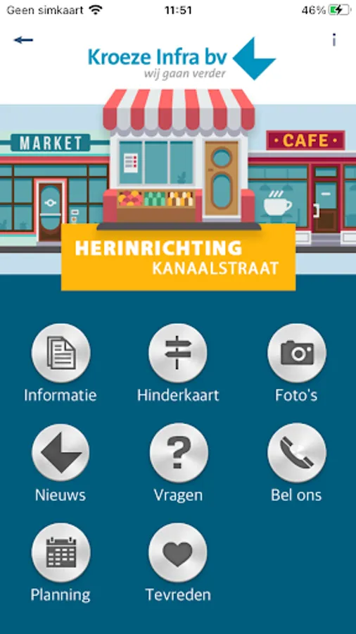 In this app you will find all information about the work of the project 'Redevelopment Kanaalstraat' of Kroeze Infra BV. Important project information, the latest schedule, and contact information are displayed . You can also leave questions, comments or complaints about the project on this app.