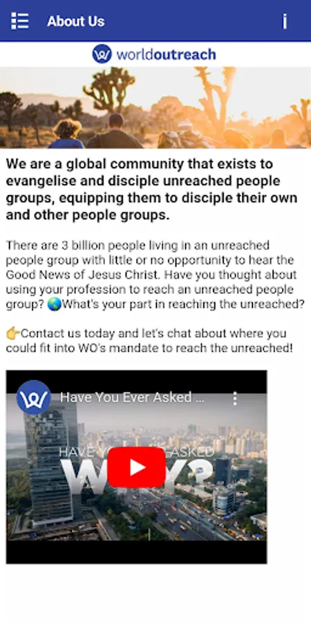 World Outreach is a global community that exists to focus on unreached people groups. With our official app, you can stay connected to our activities and initiatives. Currently, there are approximately 7,100 people groups that are classified as unreached or least-reached. This is a staggering 41% of the world’s population, equating to over 3.2 billion people. All activities, initiatives, ministries, services and structures support and work toward the end goal of evangelising and discipling UPGs