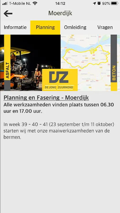 In this app you will find all information about the activities of De Jong Zuurmond in Barneveld and in Kempen municipalities. This work consists of maintenance of asphalt pavements and concrete pavements. There will be updates on the progress of work and displays information about the project. You can also ask for this app, leave comments or complaints related to the project.