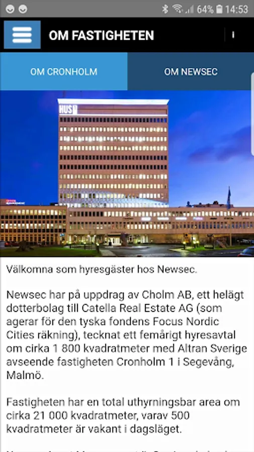 Newsec Asset Management is part of the Stronghold Group and is the Nordic region's leading property manager. What makes us successful is our commitment, our quality focus and our expertise built over many years by property management. But also our ability to constantly think in new paths. We currently manage both residential and commercial properties. Read more at newsec.se