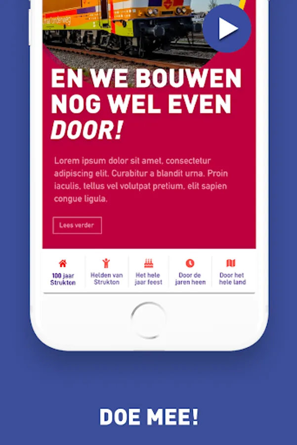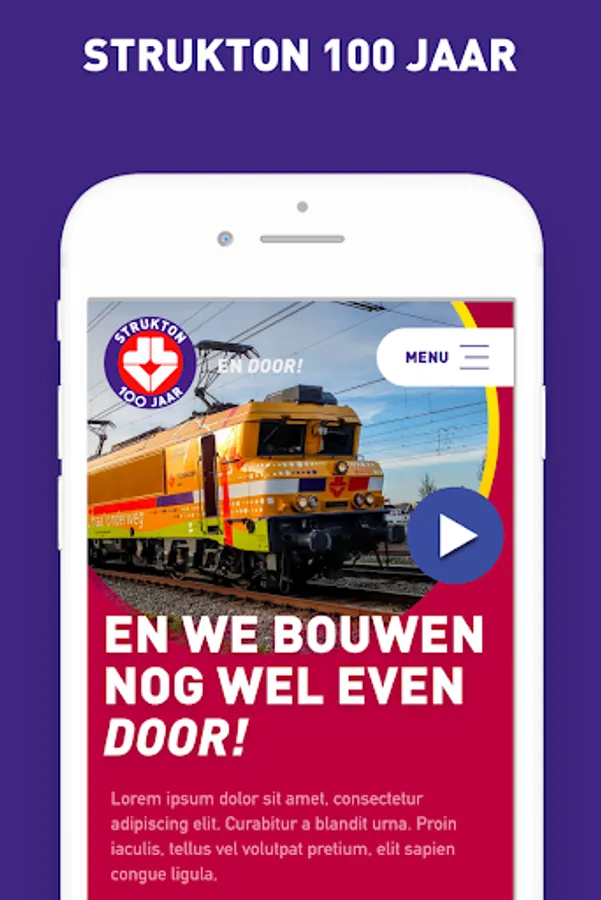 Strukton turns 100! and that is going to be celebrated. General information about this happening can be found in this app. There is also the option for employees to link to the employee portal with all kinds of fun items.