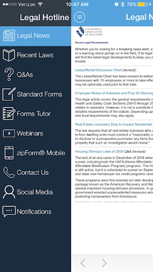 The CALIFORNIA ASSOCIATION OF REALTORS® Legal Hotline offers members the incredible benefit of receiving free legal advice over the telephone on a vast array of real-estate related topics such as contract interpretation, arbitration, litigation, tax issues, commission disputes, disclosure requirements, fair housing issues, laws governing homeowners' associations, and so on. This app offers quick access to important legal Q&As, legal news, hotline numbers, and much more.