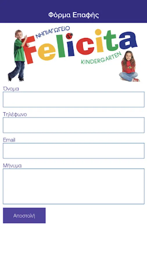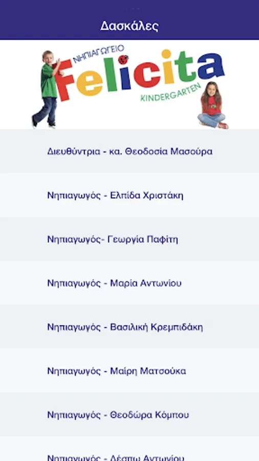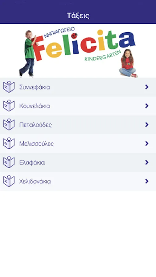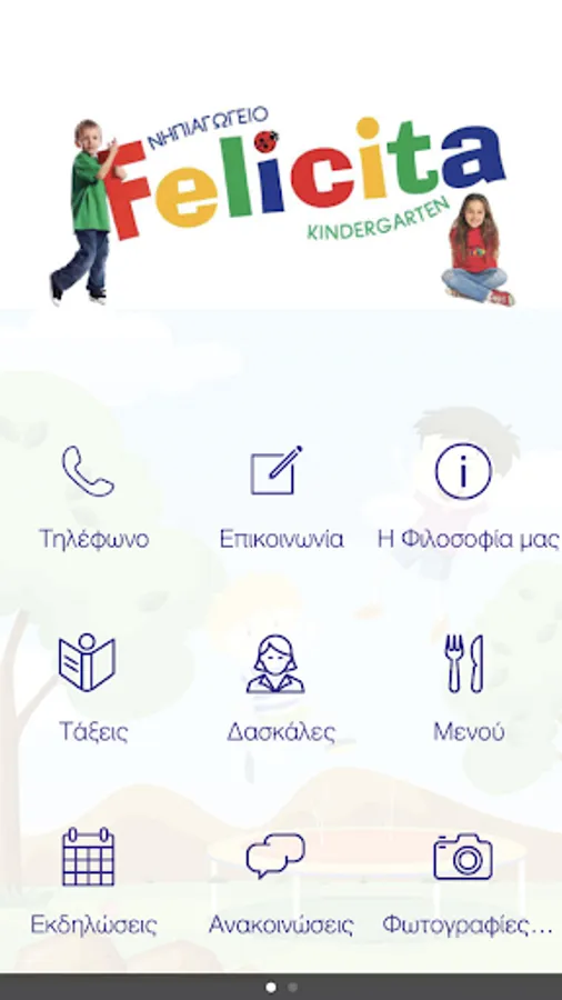 Καλώς ήρθατε στην εφαρμογή του Νηπιαγωγείου "FELICITA". Μέσω της εφαρμογής θα μπορούν οι γονείς, μέσω των κινητών τους, να ενημερώνονται με μεγάλη ευκολία και οποιαδήποτε στιγμή το επιθυμούν, σχετικά με την Τάξη των παιδιών τους και γενικά για τα νέα του Νηπιαγωγείου μας.