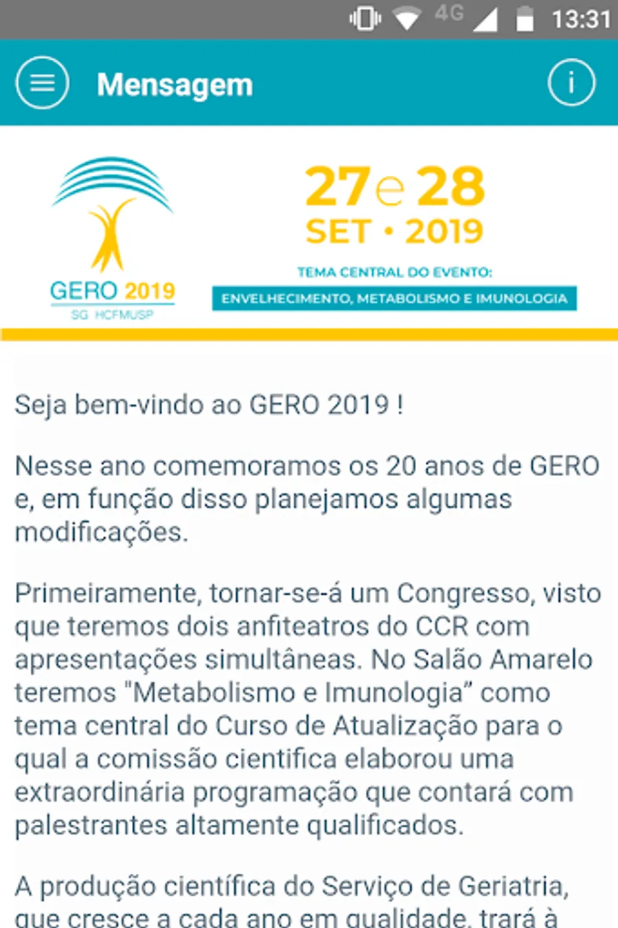 With a carefully prepared schedule and the willingness to add more and more to the knowledge about the particularities of aging, we invite you to share this learning with us at the 1st Congress of the Geriatric Service of HCFMUSP, GERO 2019.