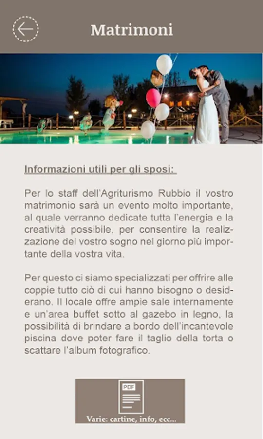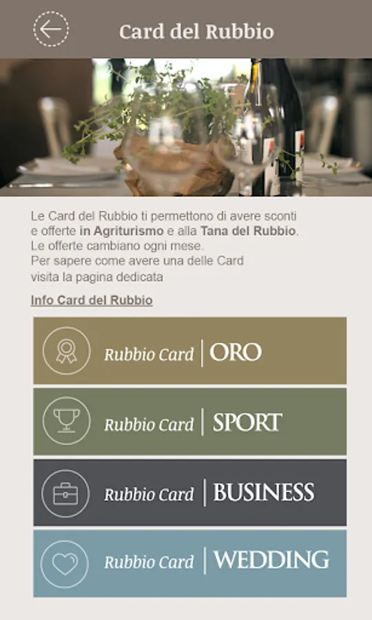 Thanks to our APP you can find all information about the wedding planning, the events we organize, access to numerous offers and promotions thanks to the private area to all customers of the farm Rubbio and also numerous discounts in shops affiliated to us. You will also discover the quality and uniqueness of the products guaranteed by the care of a short chain and linked to the territory. Here globalization stops, for a more healthy and genuine product quality due to vegetables at kilometer zero, homemade jams, fresh pasta, balsamic vinegar of Modena you'll find at hand in our shop, no counting the extensive list of fine wines all from our region.