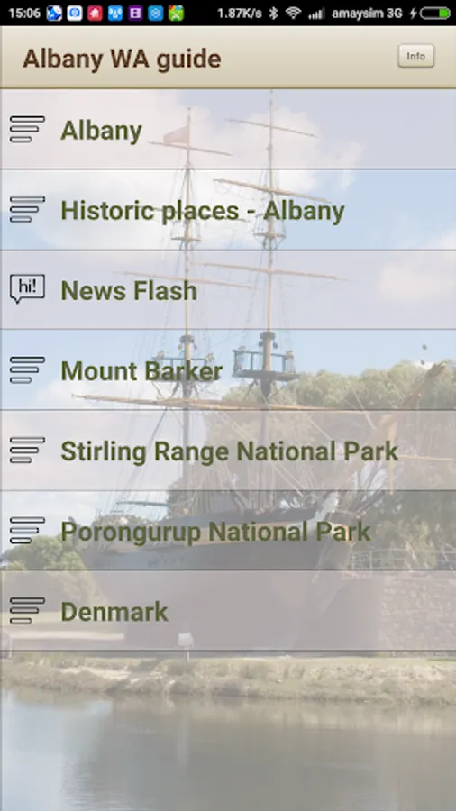 of Western Australia. The App provides GPS directions to numerous attractions in Albany and the many fascinating country towns and landmarks along the way. The app includes less travelled GPS routes through vast regions of the Great Southern that lead to picturesque country towns such as Narrrogin,Wagin and Katanning, Kojunup, Cranbrook to Bremer Bay on the coast. The Visitor Centres enroute are shown with GPS locations and contact information.
