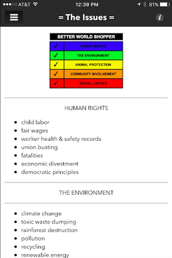 Better World Shopper allows ethical consumers to make informed choices about brands and companies by providing an A to F rating based on the companys record in the areas of: human rights, environmental sustainability, community involvement, animal protection, and social justice. All data utilized in this ranking system is provided by independent, third party sources that can be verified by consumers themselves. Based on the same system as the bestselling Better World Shopping Guide, including over 25 years worth of data, this app empowers consumers to vote with their dollars.