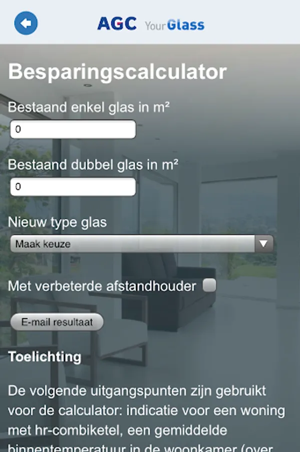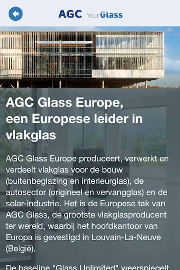 Calculator from AGC Nederland to calculate energy savings when choosing a certain type of glass. AGC Glass Europe produces, processes and distributes flat glass for construction (exterior glazing and interior glass), the automotive sector (original and replacement glass) and the solar industry. It is the European branch of AGC Glass, the largest flat glass producer in the world, with Europe's headquarters located in Louvain-La-Neuve (Belgium)