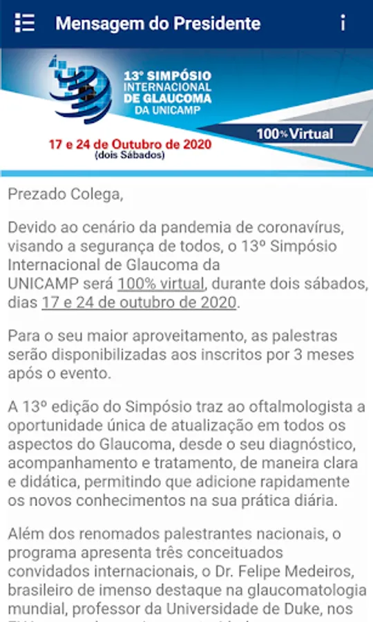 UNICAMP's 13th International Glaucoma Symposium will be held virtually, over two Saturdays, on October 17 and 24, 2020.