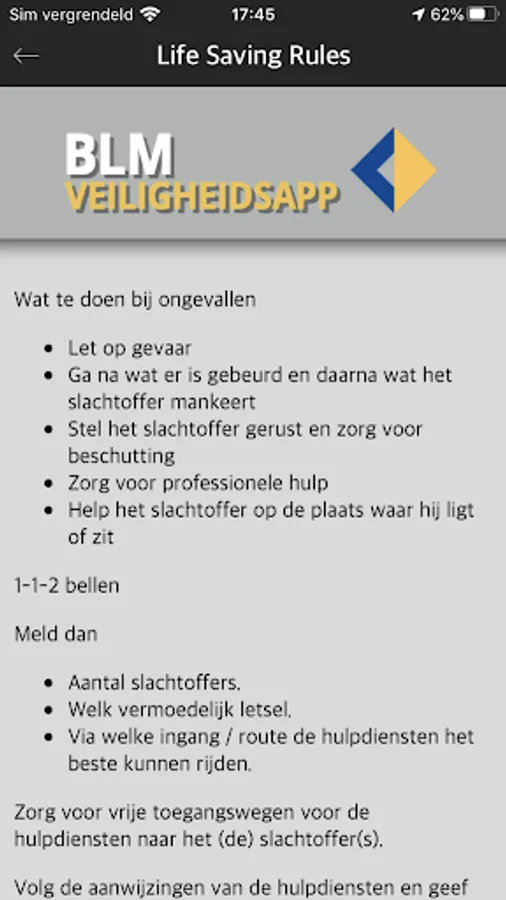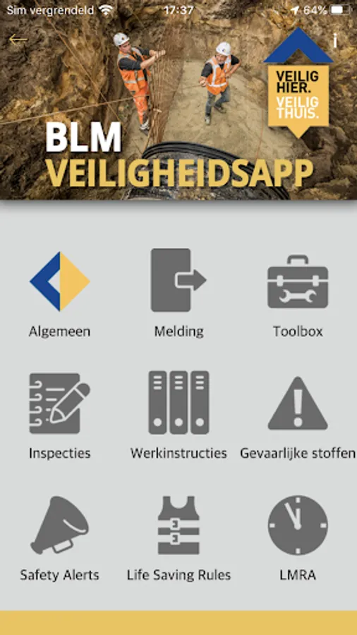 This is the BLM Wegenbouw Safety App. This contains everything about what to do in case of unsafe situations and unsafe situations can be reported. New information about safe working is regularly placed in this app and workplace inspections can be carried out.