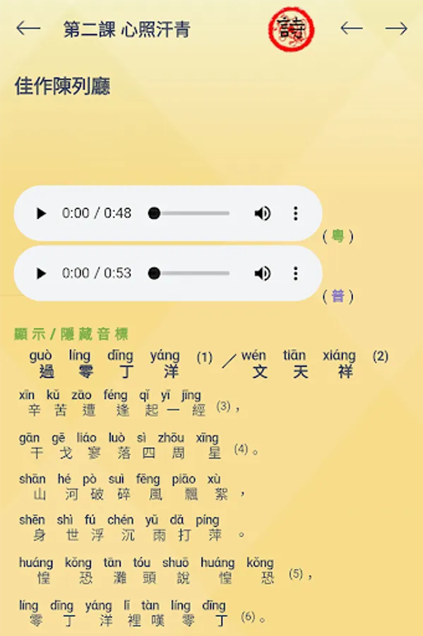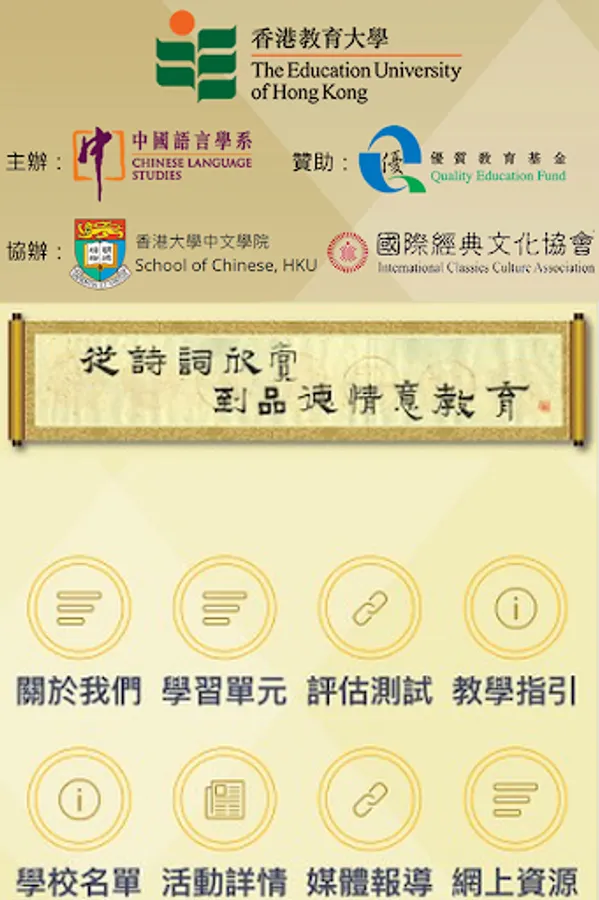 The purpose of this app is to provide the public with teaching materials for learning Classical Chinese poetry. The app covers the text, annotations, translation, and appreciation of poetry works, and is accompanied by recordings of poem recitations in Cantonese and Putonghua for mobile phone users to listen to. In addition, each section also has an assessment test for users to evaluate their learning effectiveness.