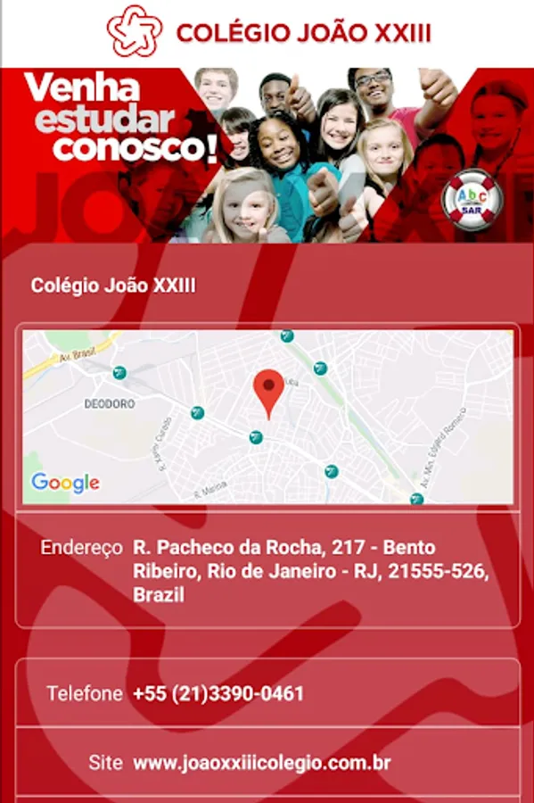 The Private Education Institution serves children from Early Childhood Education, Elementary School I and II and High School) and is located at Rua Pacheco da Rocha, 217 - Bento Ribeiro / Rio de Janeiro. Phones: +55 (21) 3390-0461 / (21) 2489-7194.