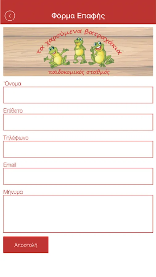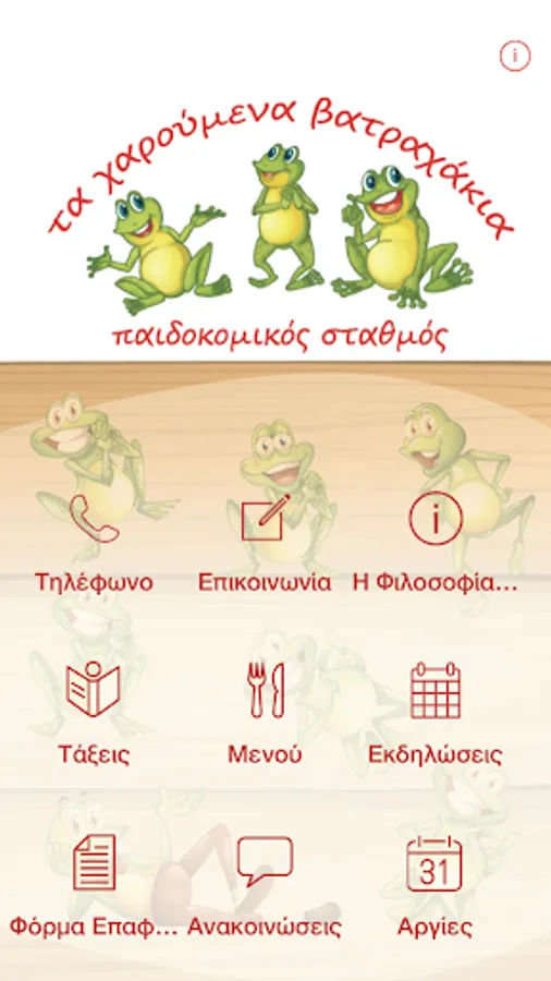 Καλώς ήρθατε στην εφαρμογή του παιδοκομικού μας σταθμού "Τα Χαρούμενα Βατραχάκια". Μέσω της εφαρμογής θα μπορούν οι γονείς, μέσω των κινητών τους, να ενημερώνονται με μεγάλη ευκολία και οποιαδήποτε στιγμή το επιθυμούν, σχετικά με την Τάξη των παιδιών τους και γενικά για τα νέα του σταθμού μας.