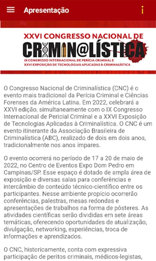 The National Congress of Criminalistics (CNC) is the most traditional event of Criminal Forensics and Forensic Sciences in Latin America. In 2022, it will celebrate the XXVI edition, simultaneously with the IX International Congress of Forensic Experts and the XXVI Exhibition of Technologies Applied to Criminalistics. The CNC is an itinerant event of the Brazilian Criminalistic Association (ABC), held every two years, traditionally in odd-numbered years.