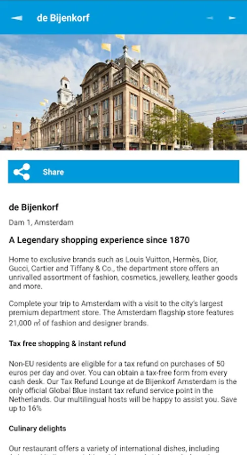 Detailed digital city map showing where you are and where your chosen venue is, including distance and navigation. Clearly marked shopping and nightlife areas.