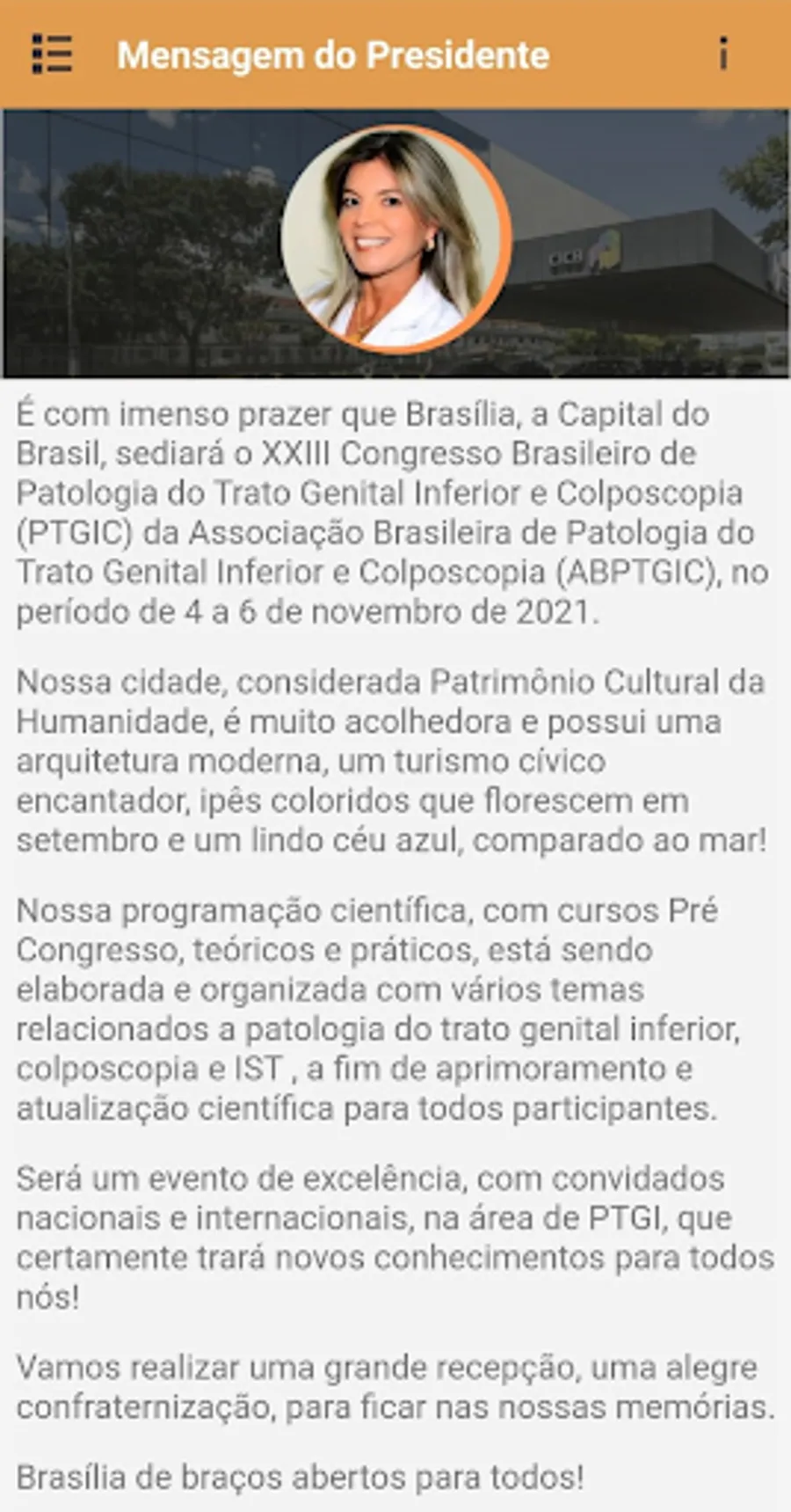 It is with great pleasure that Brasília, the Capital of Brazil, will host the XXIII Brazilian Congress of Lower Genital Tract Pathology and Colposcopy (PTGIC) of the Brazilian Association of Lower Genital Tract Pathology and Colposcopy (ABPTGIC), from 4 to 6 November 2021.