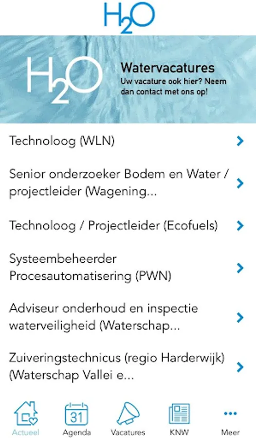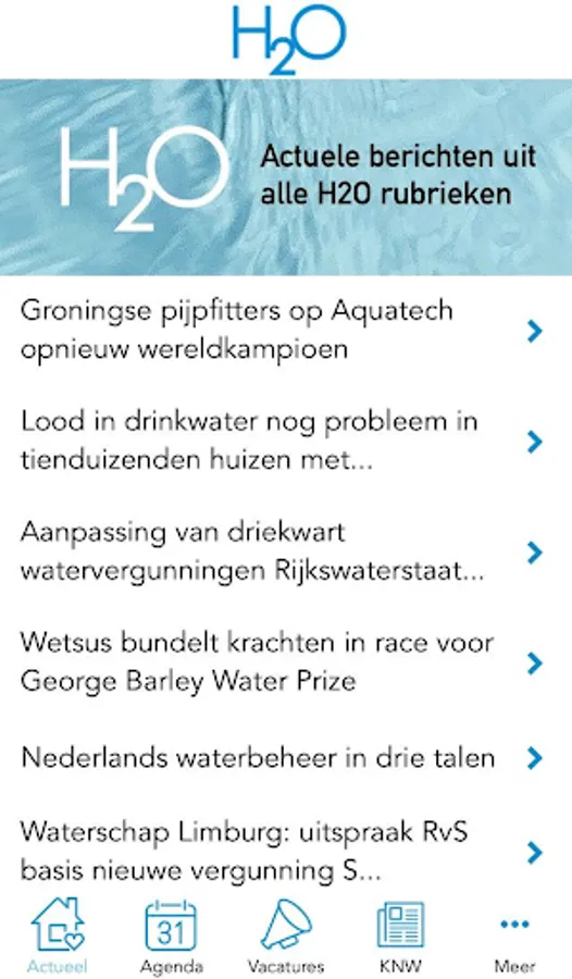 H2O is een uitgave van KNW Waternetwerk. Onder H2O vallen het vakblad H2O, kennismagazine Water Matters en H2O Online met website en de digitale nieuwsbrief H2O-nieuws, met nieuws, vakartikelen, vacatures, activiteiten, agenda en waterblogs.
