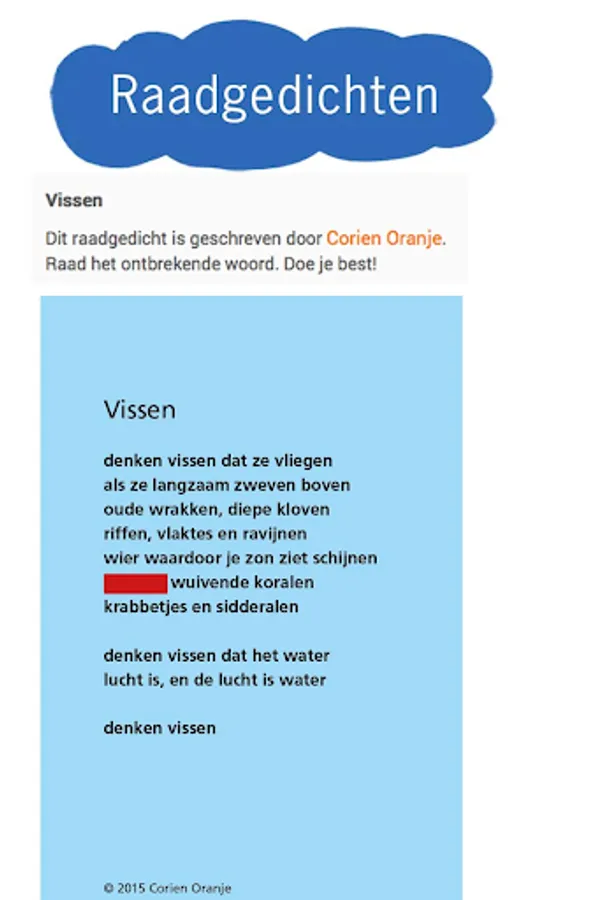 Raadgedicht is a collaboration between Het Poëziepaleis and Rian Visser and is made possible in part by De Versterking. Starting in 2016, Raadgedicht has been supported by Stichting Lezen, the Children's Book Museum, the Nederlands Letterenfonds and Stichting De Versterking.