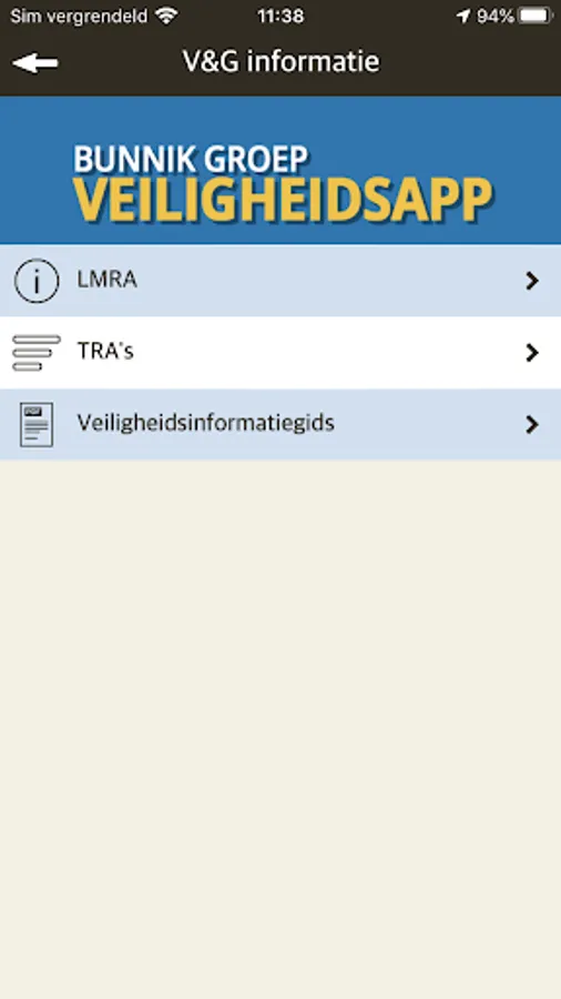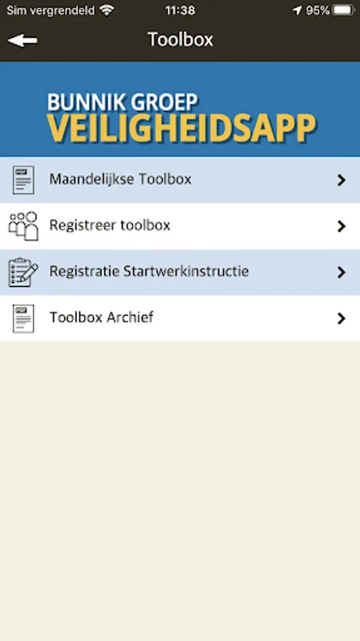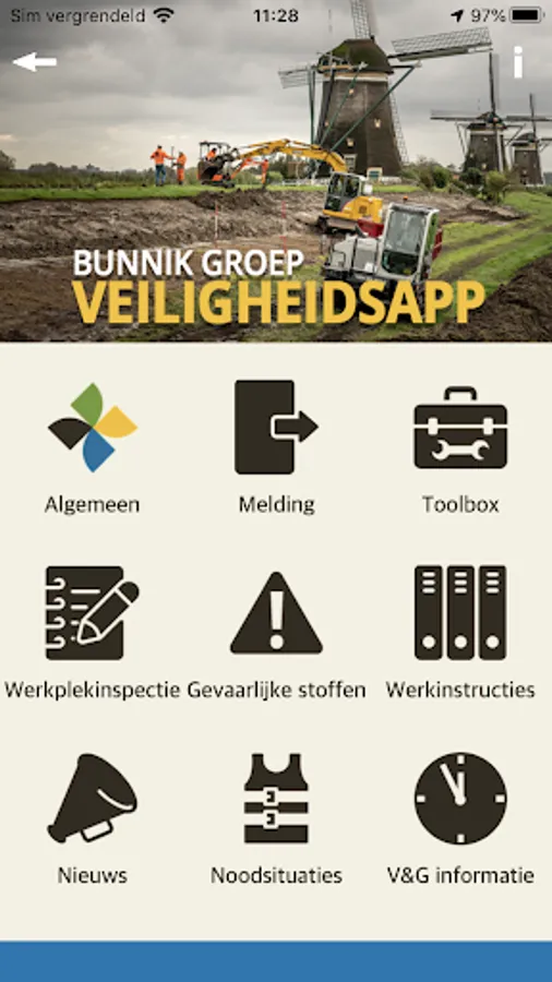 This is the Bunnik Groep Safety App. This contains everything about what to do in case of unsafe situations and unsafe situations can be reported. New information about safe working is regularly posted in this app and workplace inspections can be carried out.