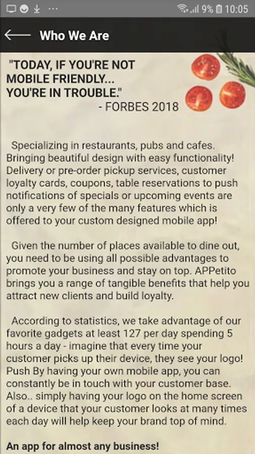 APPetito brings beautiful design with easy functionality! Delivery or pre-order pickup services, customer loyalty cards, coupons, table reservations to push notifications of specials or upcoming events are only a few of the many features which is offered to your custom designed mobile app!