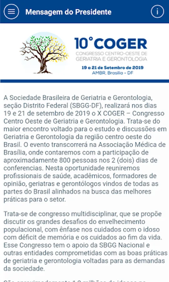 The Brazilian Society of Geriatrics and Gerontology, Federal District section (SBGG-DF), will hold on September 19th and 21st, 2019 the X COGER - Center West Congress of Geriatrics and Gerontology. It is the largest meeting focused on the study and discussions in Geriatrics and Gerontology in the central west region of Brazil. The event will take place at the Medical Association of Brasilia, where we will have the participation of approximately 800 people in the two (2) days of conferences. In this opportunity we will bring together health professionals, academics, opinion makers, geriatricians and gerontologists from all over Brazil aligned in search of best practices for the sector.