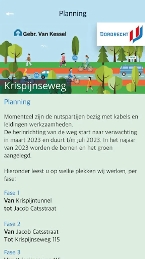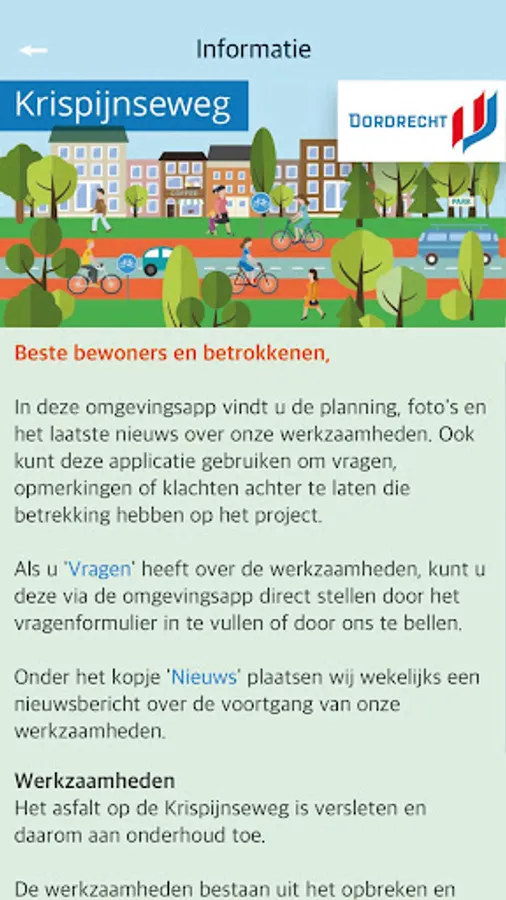 In this app you will find all information about the work on the Krispijnseweg in Dordrecht. Information is shared about accessibility, planning and progress of the work. You can also leave questions, comments or complaints related to the project via this app.