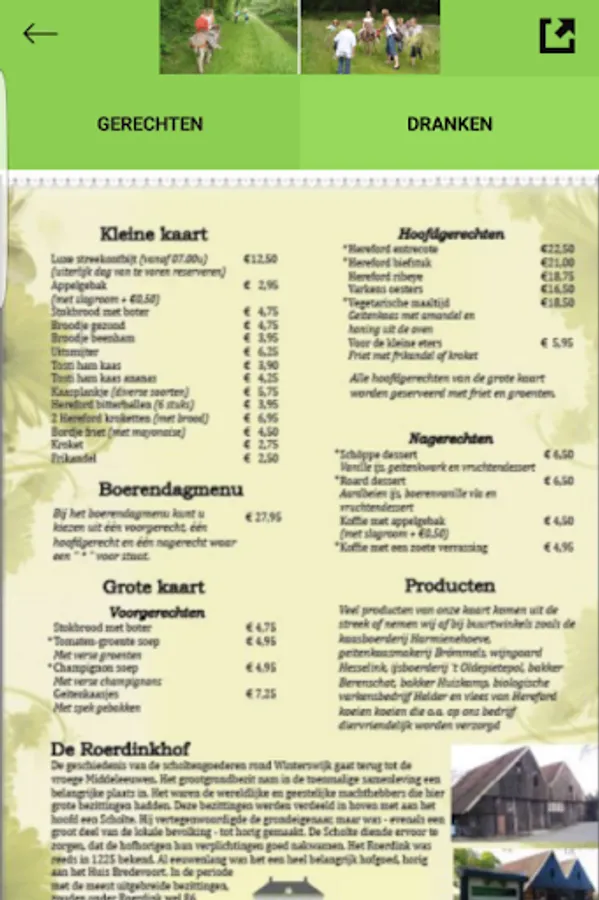 De Roerdinkhof App is er voor onze gasten, zodat u optimaal kunt genieten van uw verblijf op deze prachtige accommodatie. Vanuit deze app kunt u zich alvast orienteren op de menukaart van het boerderij restaurant in de oudste schuur van Nederland (1544).