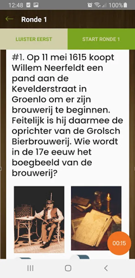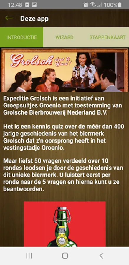 Expedition Grolsch is a challenging knowledge quiz about the history of the Royal Grolsch. The questions are asked in such a way that afterwards you will learn a lot about Grolsch's more than 400-year history. Expedition Grolsch consists of 10 rounds and each round contains 5 questions. A total of 50 multiple choice questions with no less than 200 images. Those images all relate to the questions.