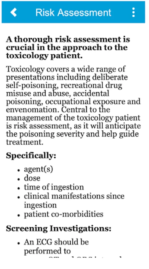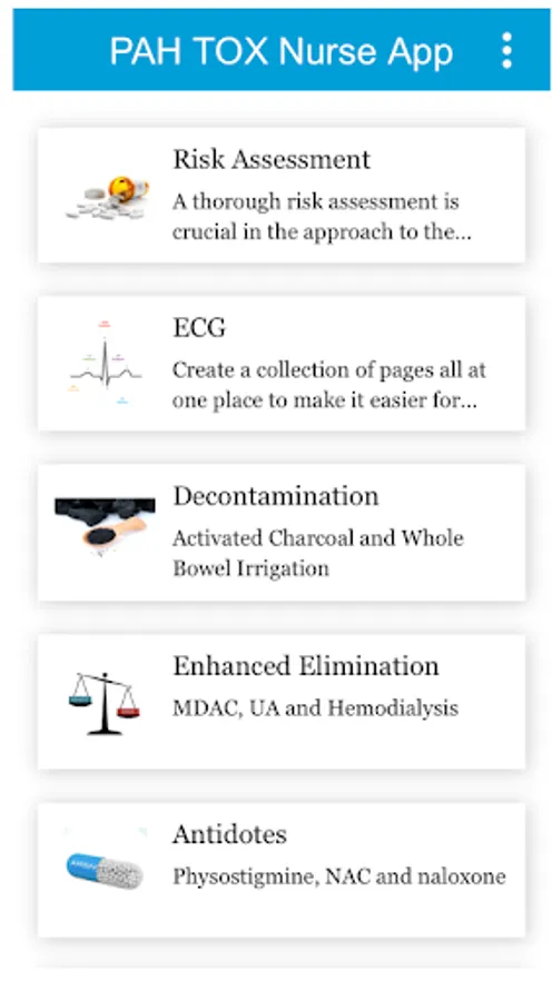 This toxicology nurse application is designed to assist nurses with the management of poisoned patients presenting to hospital. It covers a wide range of topics including risk assessment, ECG, decontamination, enhance elimination, antidotes, toxidromes and more.