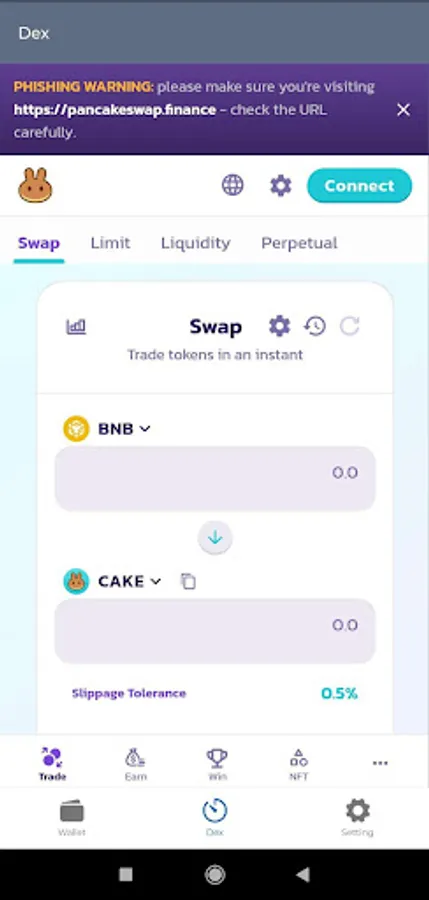 (To access PancakeSwap - Go to Dex and Click on Connect. Then select Wallet Connect from the list to connect.)