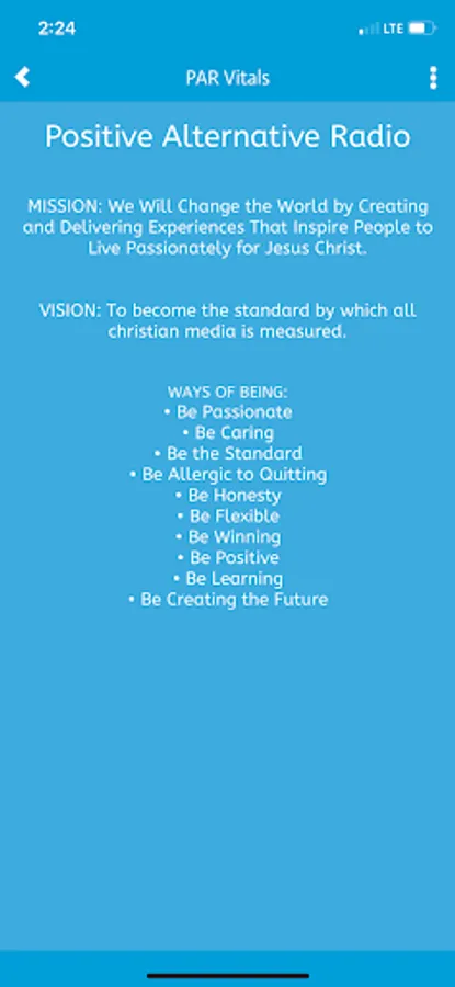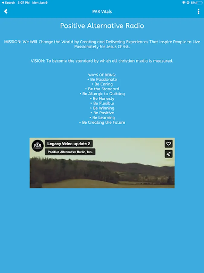 Positive Alternative Radio, a Christian Media Company. A non-profit ministry. Positive Alternative Radio's family of stations included Spirit FM, Joy FM, Walk FM, WPER, and WCQR. Our vision is to become the standard by which all Christian Media is measured. Our mission is to change the world by inspiring people to live passionately for Jesus Christ.