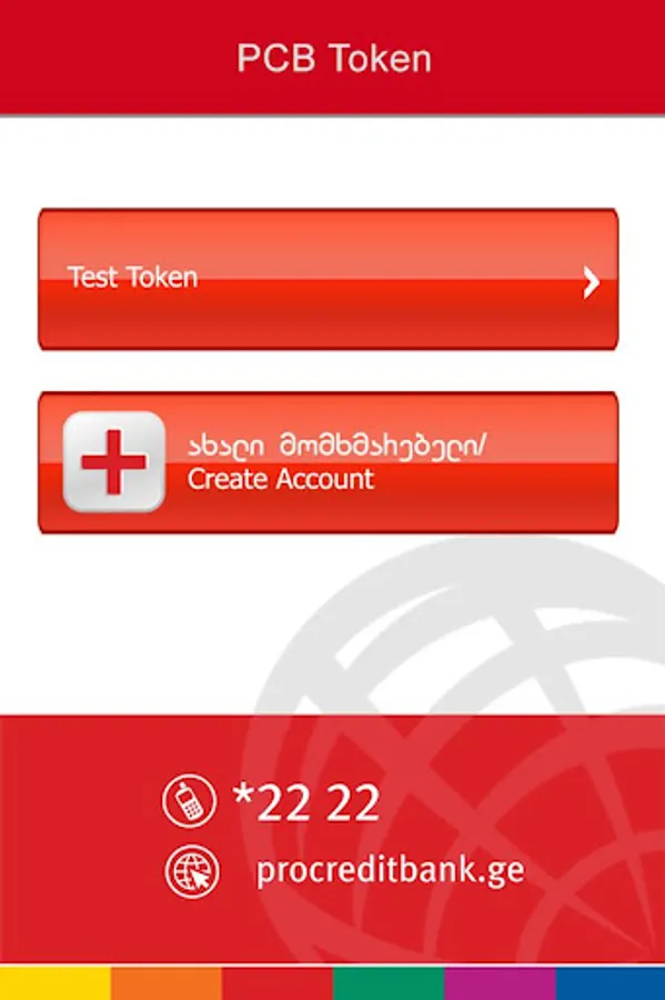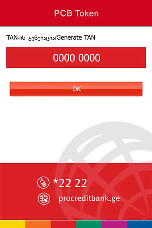ProCredit Bank Mobile Token generates a one-time TAN (transaction number) which is used to confirm transfers and other transactions over the Internet and through the mobile banking system. The TAN generated is an alternative to the token device and SMS TAN and allows you to confirm as many transactions as you want. Private and business clients using the full Internet Banking package can access this PCB Token generation application from Georgia and abroad without activating roaming.
