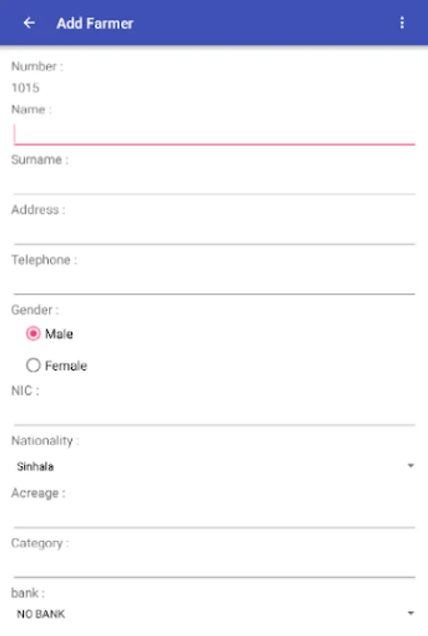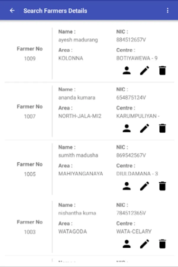You can add famer master file through this app. Farmer name, NIC no, account details. Etc can add easily. After register the farmer, you can add his issues and gherkin receiving to speed up the farmer payment system.