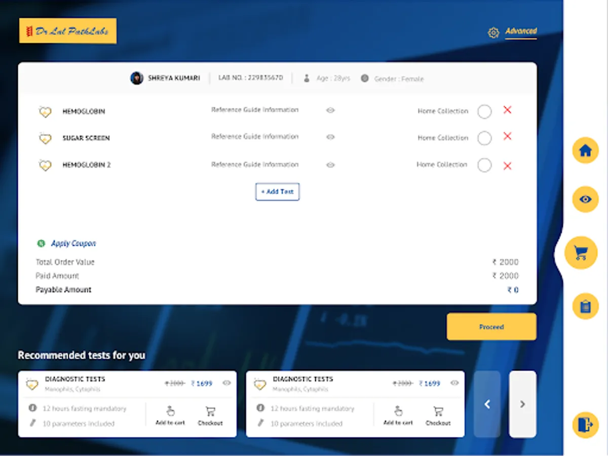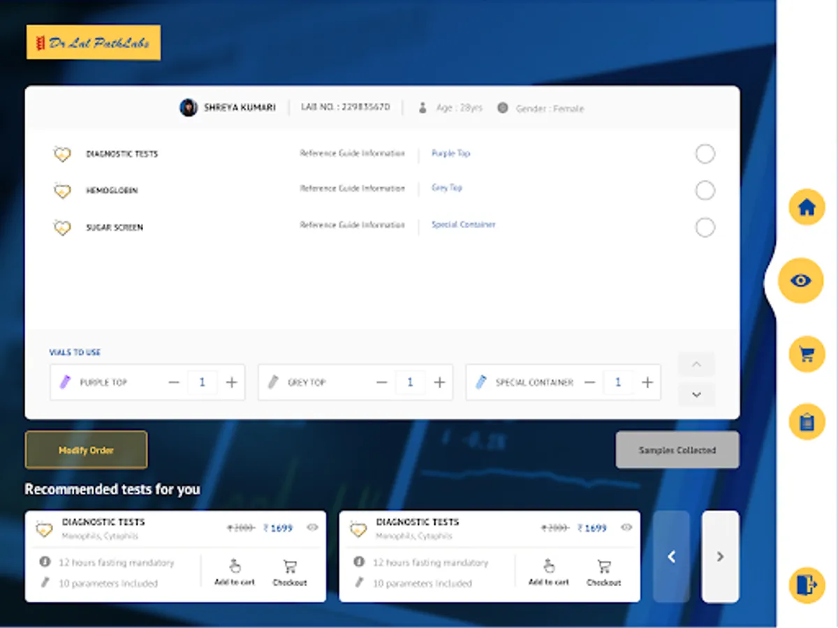 Phlebotomy kiosk is placed at sample collection room and the phlebotomist would be able to see the order booked and can complete the check out along with sample collection.