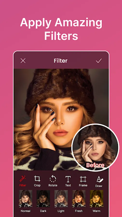 Select any photo, pick any area to edit photo. Use various app feature like brightness, shades, colors and many more to give photo effects. Photo editing app has multiple features and layout, user can select any of them and photoshop their picture as they like. This photo editing app has user friendly interface and liked by many. This picture editor provides many unique and special features to edit photo.
