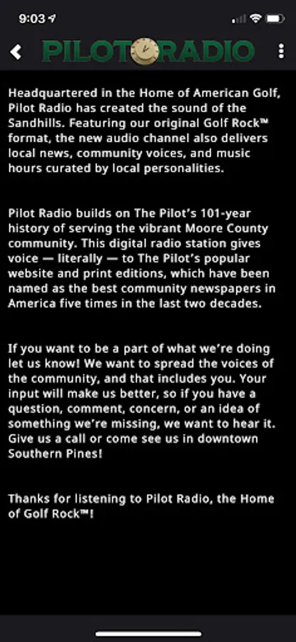 Headquartered in the Home of American Golf, Pilot Radio has created the sound of the Sandhills. Featuring our original Golf Rock format, the new audio channel also delivers local news, community voices, and music hours curated by local personalities.