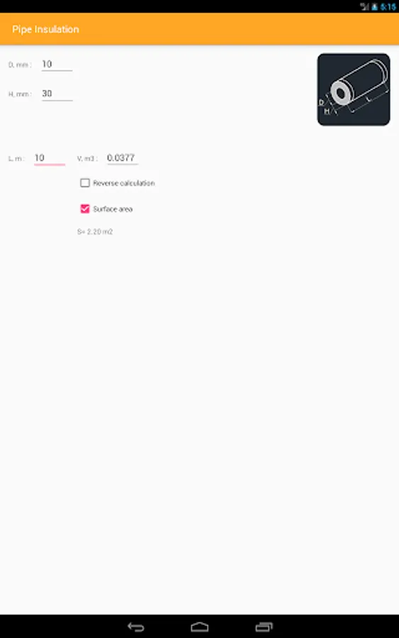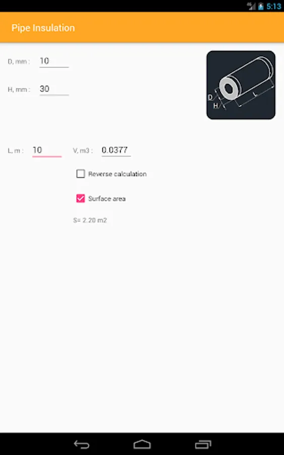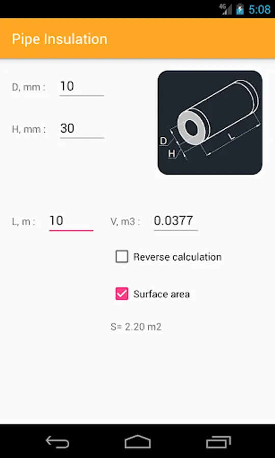 Pipe Insulation Calculator supports Reverse settlement (the length of the pipeline from a given amount of insulation) and the calculation of the surface (for determining the area of the material).