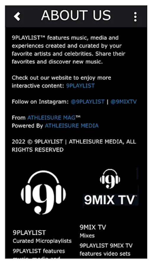 9PLAYLIST™ features music, media and experiences hosted, curated and created by your favorite artists and celebrities. Share their favorites and discover new music.