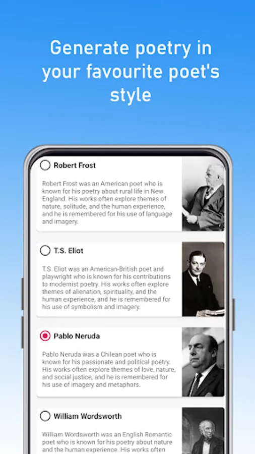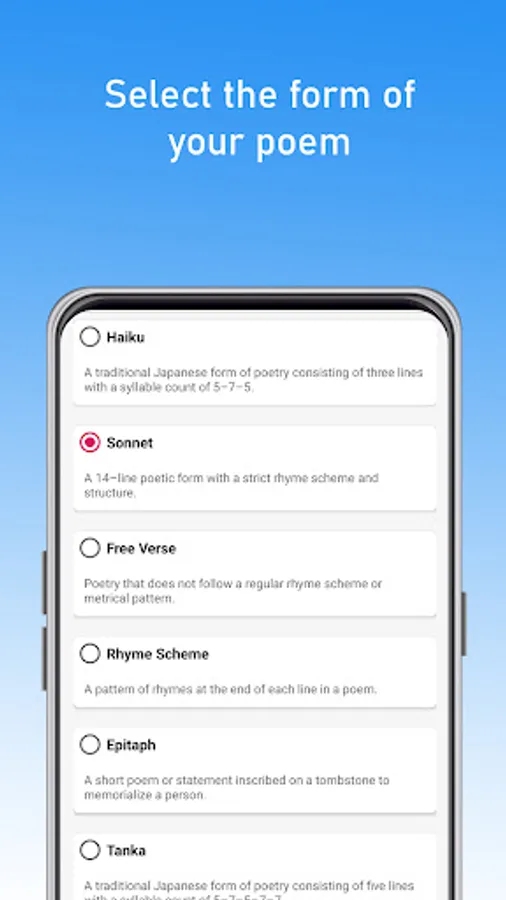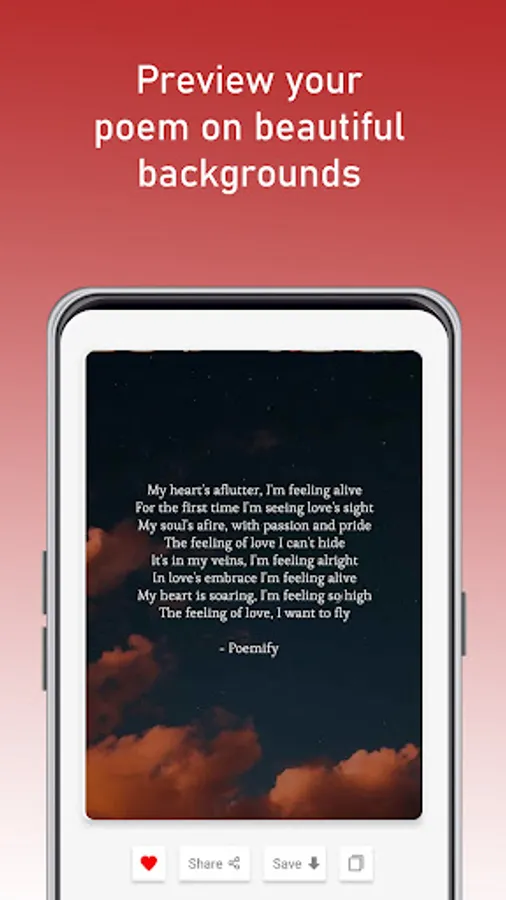 With Poemify, you'll experience a seamless fusion of classic poetic inspiration and modern language technology. Whether you're a seasoned wordsmith or just beginning your poetic journey, our app caters to your unique voice and style. It's time to unlock your inner poet and let your imagination soar. Try Poemify today, and transform your thoughts into poetic masterpieces.