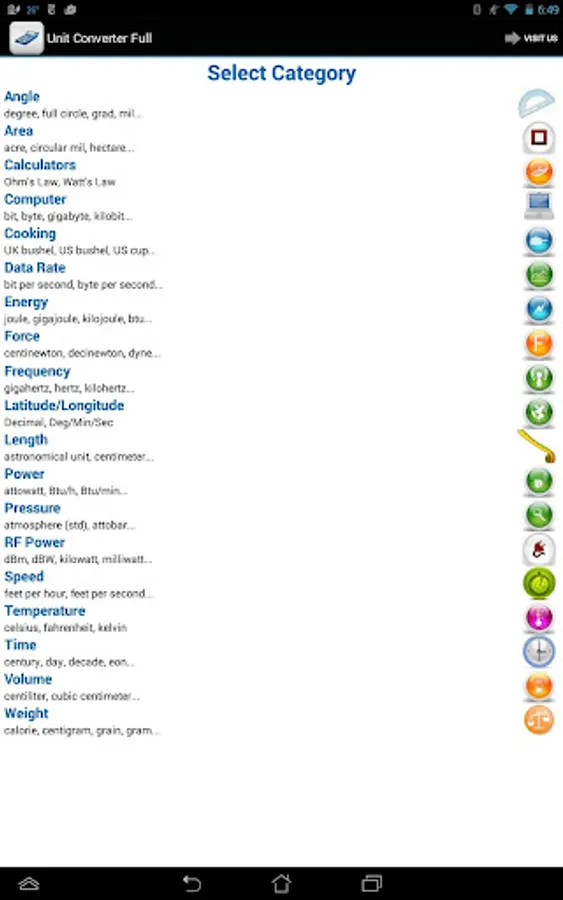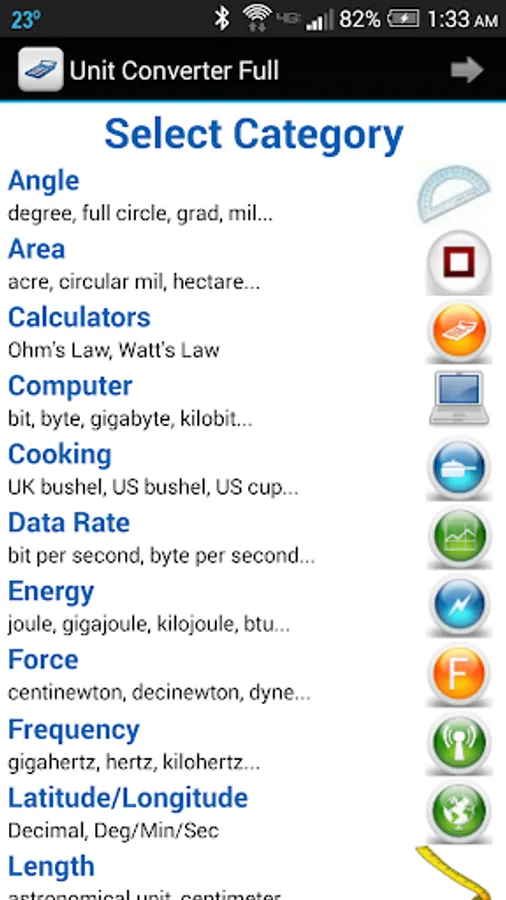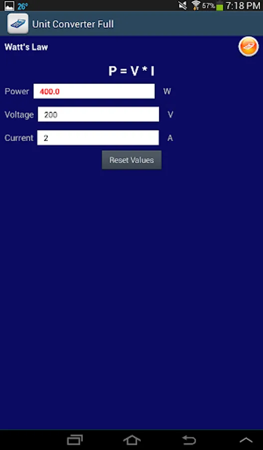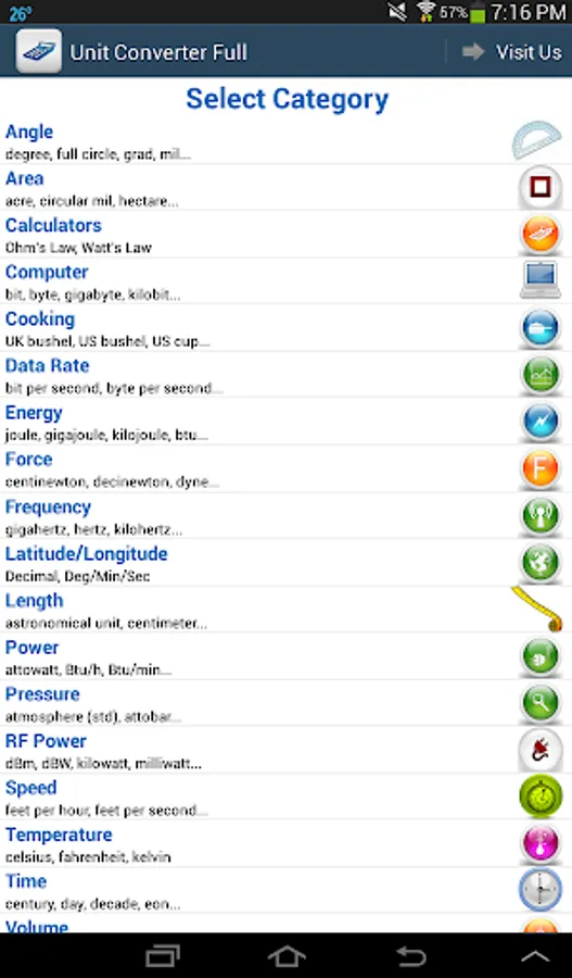 Convert units such as length, weight, volume, and cooking to engineering units such as power, force, pressure, frequency, and energy. You can choose from many other different categories for converting units. Please see my website for the full list of units and categories implemented in this unit converter. Even has Ohm's and Watt's Law equations built in.