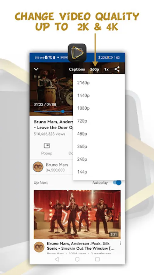 - Change video quality (144p, 240p, 360p, 480p, 720p, 720p60, 1080p, 1080p60, 2K, 4K)
