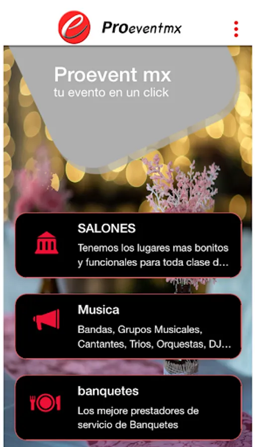 Proeventmx  el éxito de tu evento en tu celular, una app que te ayuda a encontrar a los mejores proveedor y te muestra su calificación, así como su servicios a travez de fotografías y Videos