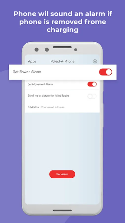 • App allows you activate the alarm after you plug it in for charging. Once activated, if the phone is unplugged, it would trigger the alarm.