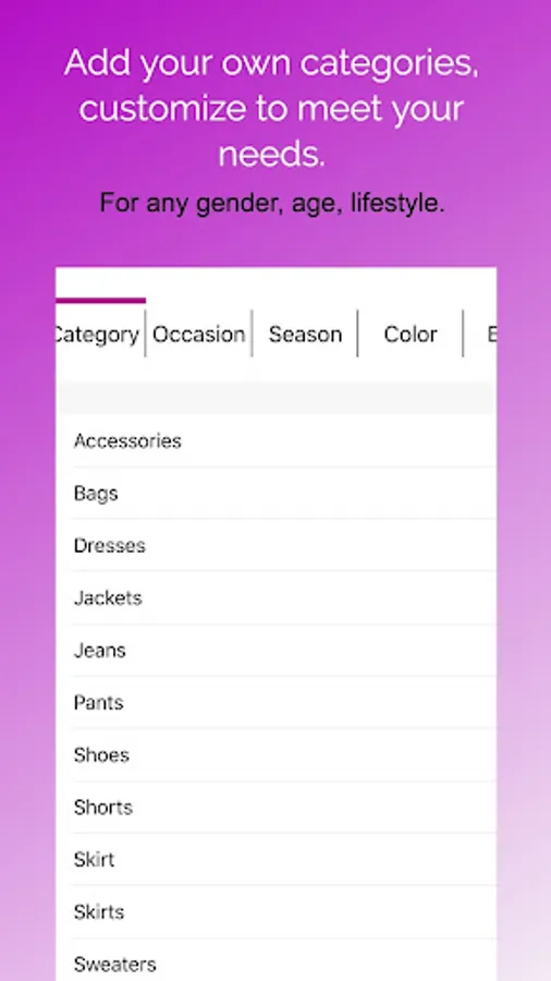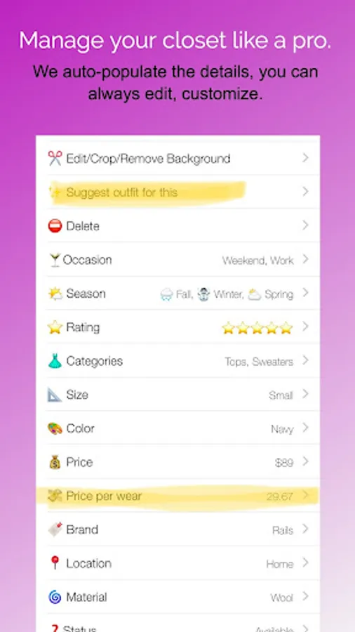 You can take photos, add items directly from web or our database. Pureple auto categorizes them for you. Organize your items by season, occasion, color, brand, size, location, availability, price, material, rating and more. Add your own categories. With powerful filtering capabilities, see exactly what you are looking for in seconds. Create your own lookbook, stylebook.