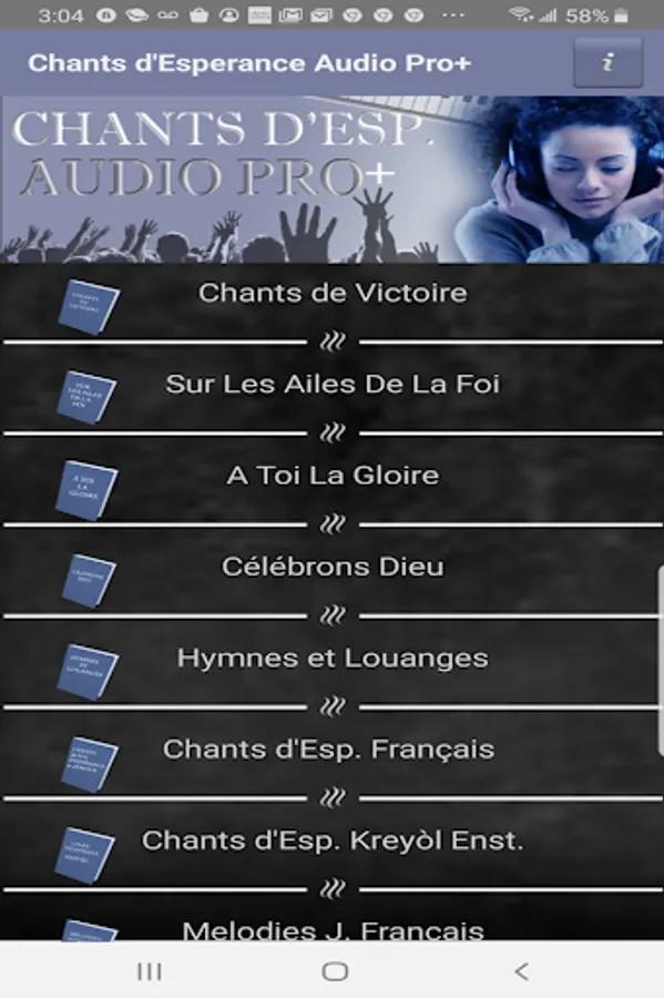 This app is the Pro+ Version of the missing companion to the Chants D'esperance hymns book, produced by Chants d'Esperance Audio Project organization ; This Pro+ contains 10 instrumental hymns, such as Chants de Victoire, A Toi La Gloire, Hymnes et Louanges, Sur Les Ailes de la Foi, Célébrons Dieu, Chants d'Esperance, Mélodies Joyeuses Francais/Creole and Haiti Chante Avec Radio Lumiere. Once the play button on the first song is pushed, the app will automatically play the rest of the hymns for you; easy to use; the goal is to help you learn all the songs as written by the composers with a full instrumental back up for each song. This app is ideal for personal devotion, weddings, wedding receptions, walking in the park, and special occasions where a spiritual atmosphere requires spiritual instrumentals;