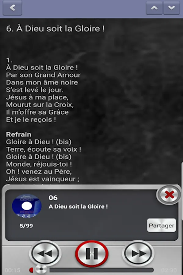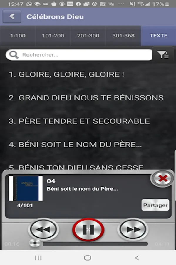 Cette application vous est présentée par l'équipe du projet Chants d'Espérance audio. La version Pro+ contient 10 recueils d'hymnes instrumentaux et leurs paroles, qui sont les suivants: À Toi la Gloire, Chants de Victoire, Sur Les Ailes de la Foi, Célébrons Dieu, Hymnes et Louanges, Chants d'Espérance Français et Kreyòl, Mélodies Joyeuses Français / Créole et Haiti Chante Avec Radio Lumiere. Nous fournissons également le texte de chaque livre sauf À Toi la Gloire - toujours en cours. Nous pouvons maintenant chanter les cantiques en écoutant a la musique jouée. Une fois que le bouton de play de la première chanson est enfoncé, l'application jouera automatiquement le reste des hymnes pour vous; facile à utiliser; l'objectif est de vous aider à apprendre toutes les cantiques écrits par les compositeurs avec une sauvegarde instrumentale complète pour chaque quantique. Cette application est idéale pour le service de louange et d'adoration, la dévotion personnelle, les mariages, les réceptions de mariage, la marche dans le parc et les occasions spéciales où une atmosphère spirituelle nécessite des instruments spirituels;