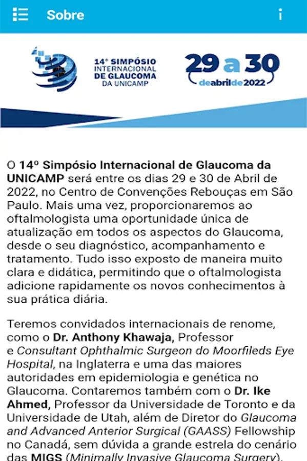 The 14th Unicamp International Symposium on Glaucoma, to be held between the 29th and 30th of April 2120, at the Rebouças Convention Center in São Paulo, will provide the ophthalmologist with a unique opportunity to update on all aspects of Glaucoma, from its diagnosis, follow-up and treatment. In a very clear and didactic way, allowing the ophthalmologist to quickly add new knowledge to his daily practice.