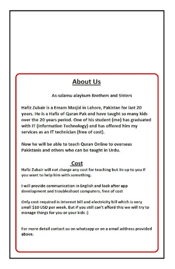 Through this app you can find contacts for teachers, who will teach Quran online to you or your kids in Urdu.