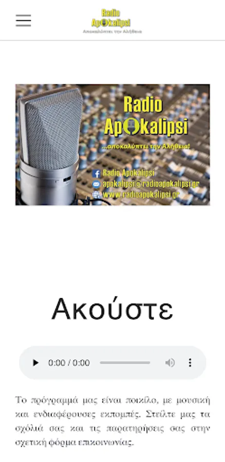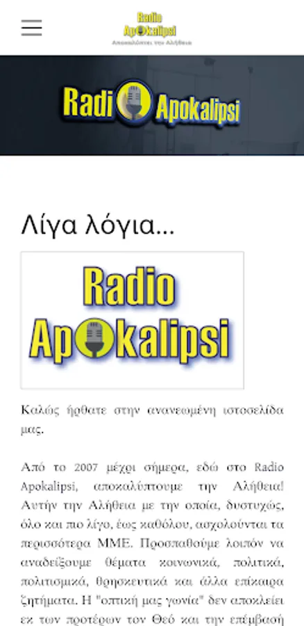 From 2007 until today, here at Radio Apokalipsi, we reveal the Truth! This Truth, with which, unfortunately, more and less, if not at all, most of the mass media deal with. So we try to highlight social, political, cultural, religious and other topical issues. Our "point of view" does not exclude in advance God and His intervention in our history and in our daily life. Rather, this is what we believe and support openly, arguing against the current of our time, which turns with indifference, irony and disparagement without carefully considering how God reveals himself to man, what are His principles and what are His laws , as well as how much he really cares about each of us. So we, in defiance of our time, will continue to "reveal the Truth.