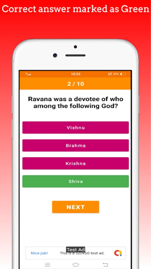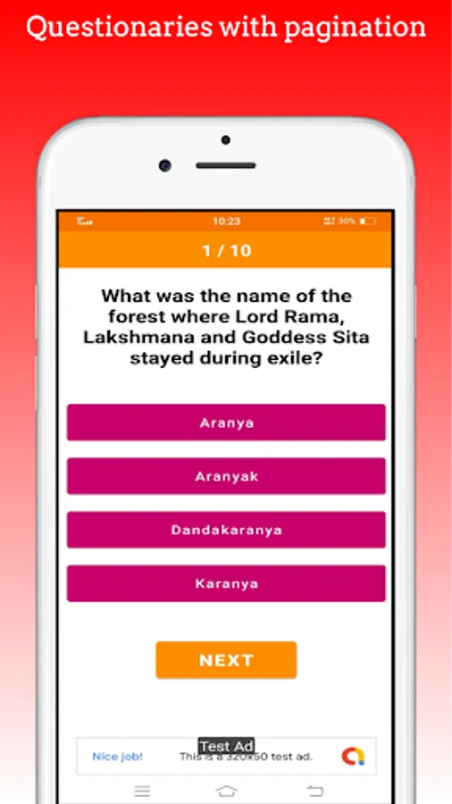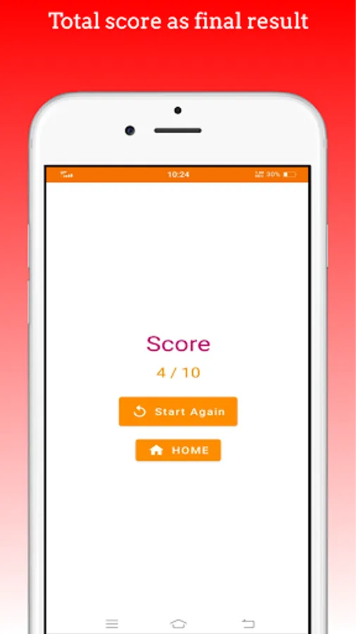 There is a bunch of 10 questionaries on quiz start. On answering question one by one, result will be shown at the end of quiz. While attending the questions, there is a display on top to see the current question. On result page, there is a option to start quiz again.